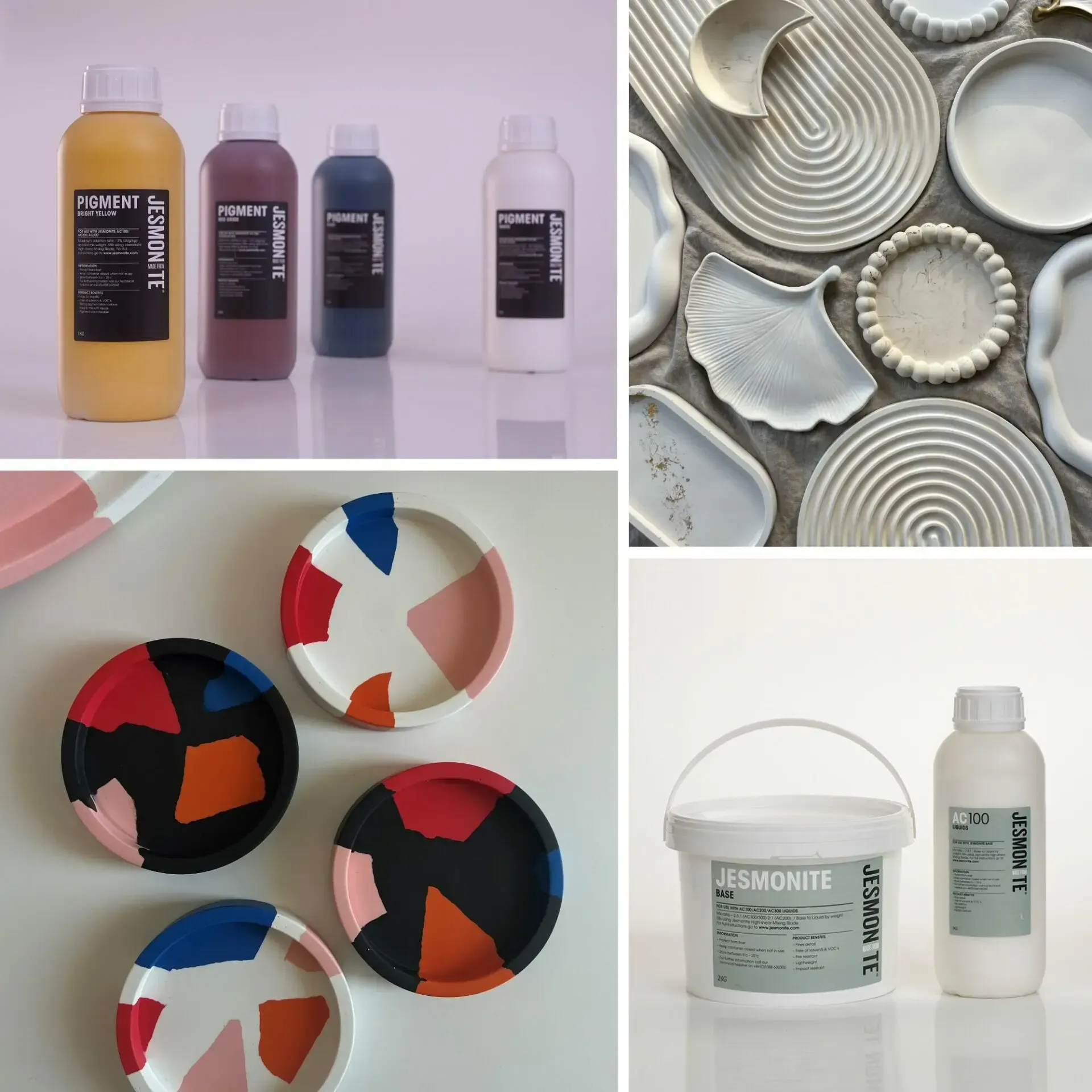 Grazie alla compatibilità con gli stampi in silicone, Jesmonite è ideale per produrre in serie oggetti artistici o decorativi, come piastrelle, piatti, quadri a rilievo, oppure repliche per scopi didattici, promozionali o commerciali.